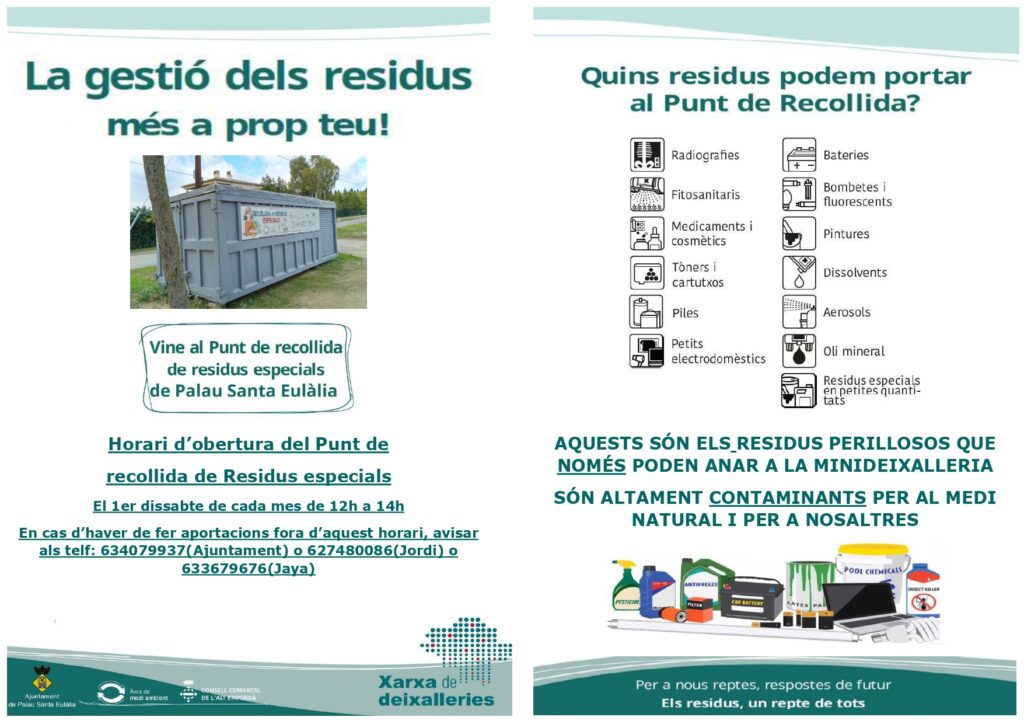 Ja tenim el punt de recollida de residus especials a la minideixalleria situada davant de la Plaça 1 d’Octubre a Santa Eulàlia. Podeu fer les aportacions el 1r dissabte de cada mes de 12 h a 14 h i en cas d’haver de fer aportacions fora d’aquest horari us podeu posar en contacte als telf: 634 079 937 (Ajuntament) o 627 480 086 (Jordi) o 633 679 676 (Jaya).