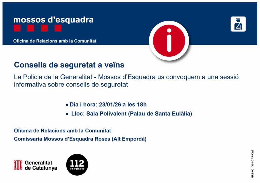 La Policia de la Generalitat – Mossos d’Esquadra us convoquem a una sessió informativa sobre consells de seguretat.